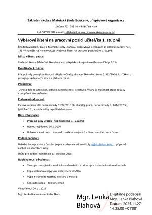 Výběrové řízení na pracovní pozici učitele I. stupně - ZŠ a MŠ Loučany