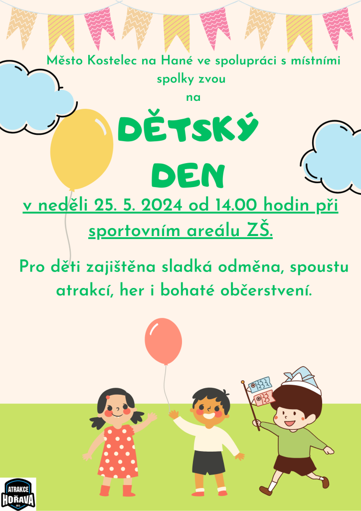 Město Kostelec na Hané ve spolupráci s místními spolky zvou na dětský den, který se uskuteční v neděli 25. května 2025 od 14.00 hodin při sportovním areálu ZŠ.