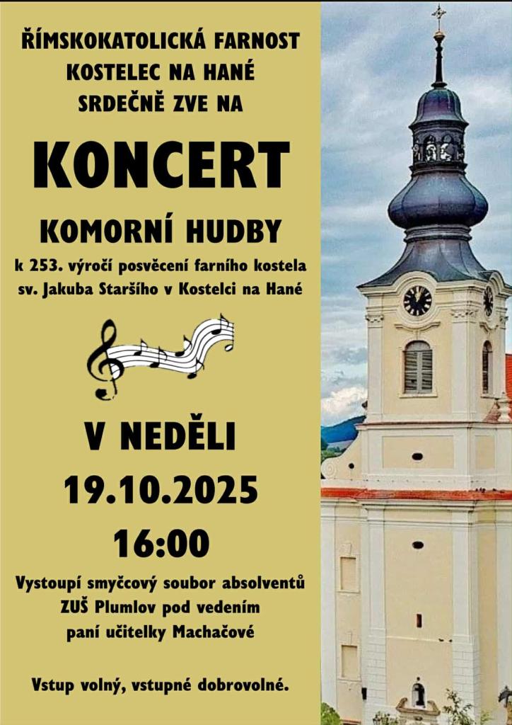 Římskokatolická farnost Kostelec na Hané zve na koncert komorní hudby k 253. výročí posvěcení farního kostela sv. Jakuba Staršího v Kostelci na Hané, který se uskuteční v neděli 19. října v 16.00 hodin.