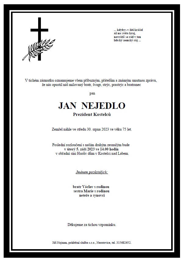 Svíčka života prezidenta všech Kosteláků, Kostelečáků a Kostelanů, našeho kamaráda, kolegy a bezva parťáka Jana, Honzy, Jeníka nebo Honzíka Nejedla, jak jsme mu rádi a s láskou říkávali, dohořela bohužel dne 30. srpna 2023. Odešel ve věku 75 let důstojně, v klidu a bez bolesti. Nejen jeho rodině a blízkým, ale nám všem, kteří jsme ho dlouhá léta znali, zůstane v mysli vzpomínka na slušného, milého, pracovitého a společenského člověka, kterého měl každý rád. Duchovní otec myšlenky pravidelného setkávání všech Kostelců z celé naší republiky měl a stále bude mít kamarády a známé v každém městě, obci i malé vesničce mající kostel ve svém znaku i jménu. A i když náš pan prezident již není mezi námi, v našich srdcích po něm prázdno nezůstane. Teď už bude asi hrát na svoje klávesy všemi oblíbené písničky o princezně ze mlejna, Kosteleckou polku a nebo hit Madóóno má... nejspíš někde v nebeském sboru, ale my z Kostelců na něj nikdy nezapomeneme.