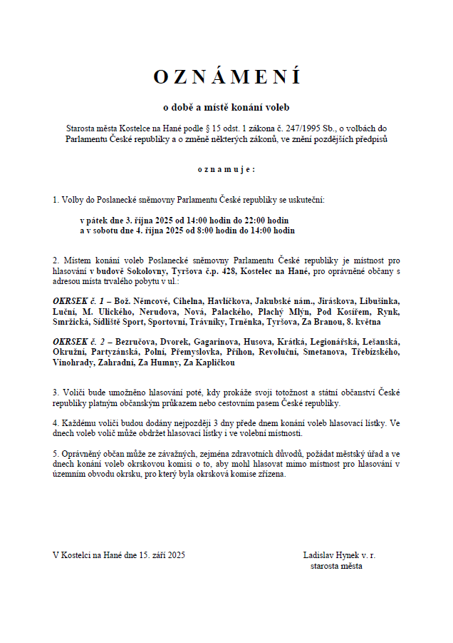 Aktuality - Oznámení o době a místě konání voleb do Poslanecké sněmovny Parlamentu České republiky