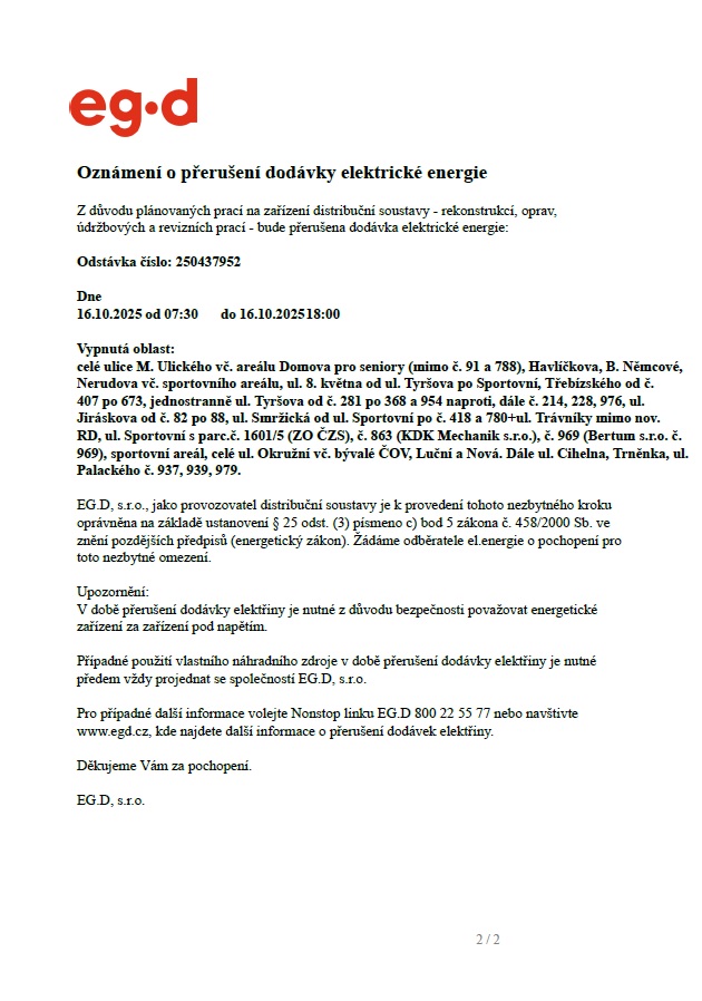 Aktuality - Oznámení o přerušení dodávky elektrické energie - 16.10.2025