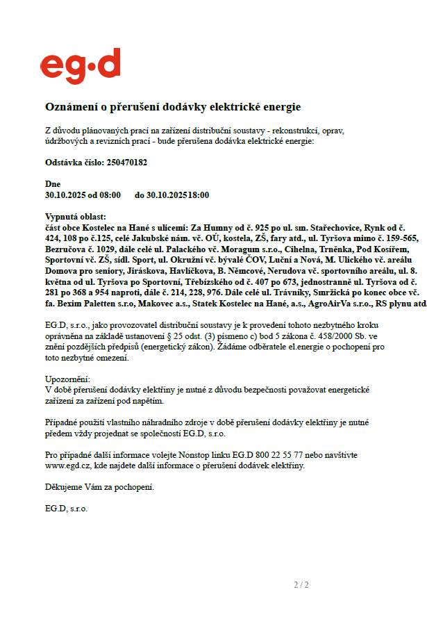 Aktuality - Oznámení o přerušení dodávky elektrické energie - 30.10.2025