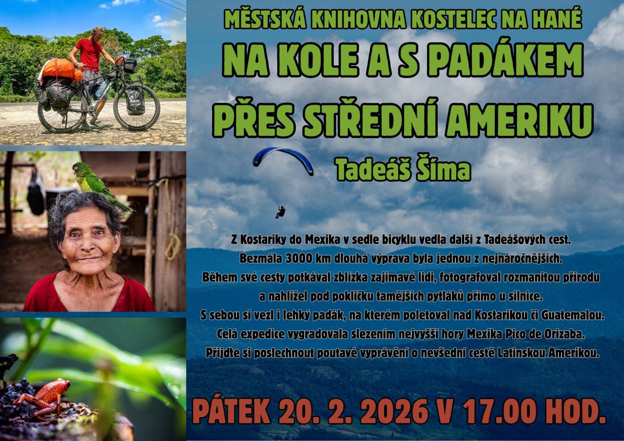 Městská knihovna Kostelec na Hané zve na cestovatelskou přednášku Tadeáše Šímy, která se uskuteční v pátek 20.2.2026 v 17.00 hodin.