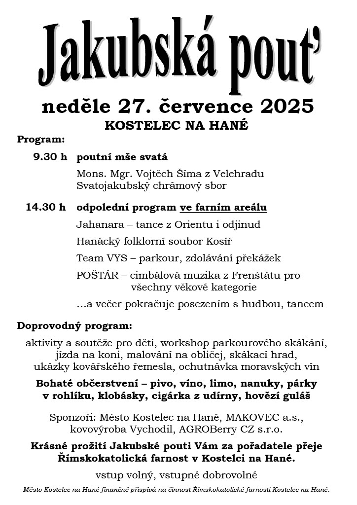 Uskuteční se v neděli 27. července 2025. Těšit se můžete na bohatý kulturní program i občerstvení.
