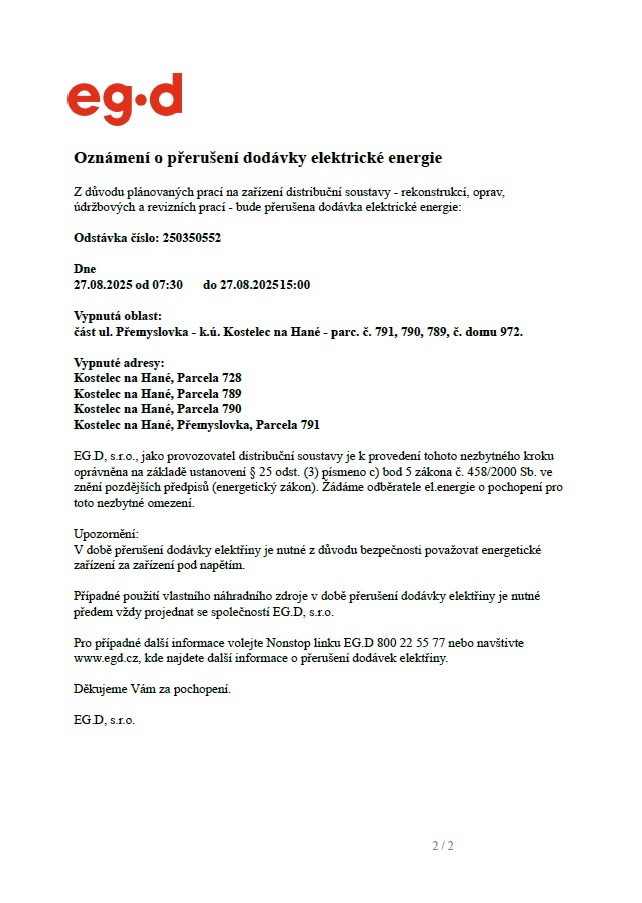 Oznámení o přerušení dodávky elektrické energie - 27.8.2025