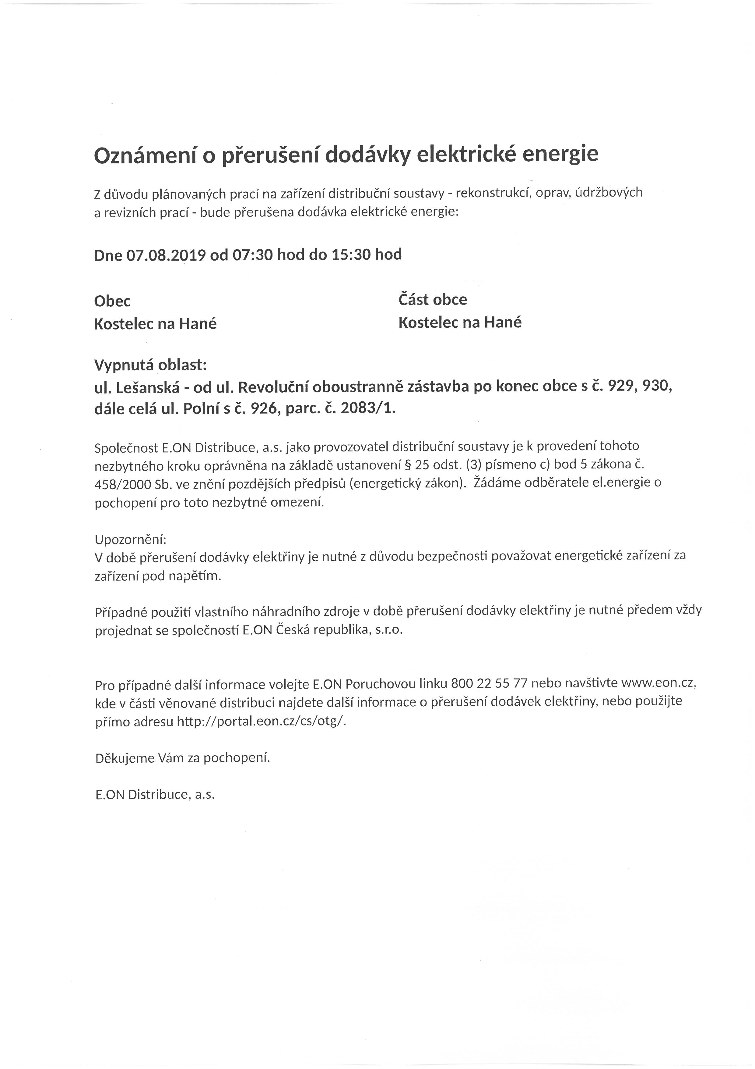 Oznámení o přerušení dodávky elektrické energie - 7. srpna 2019