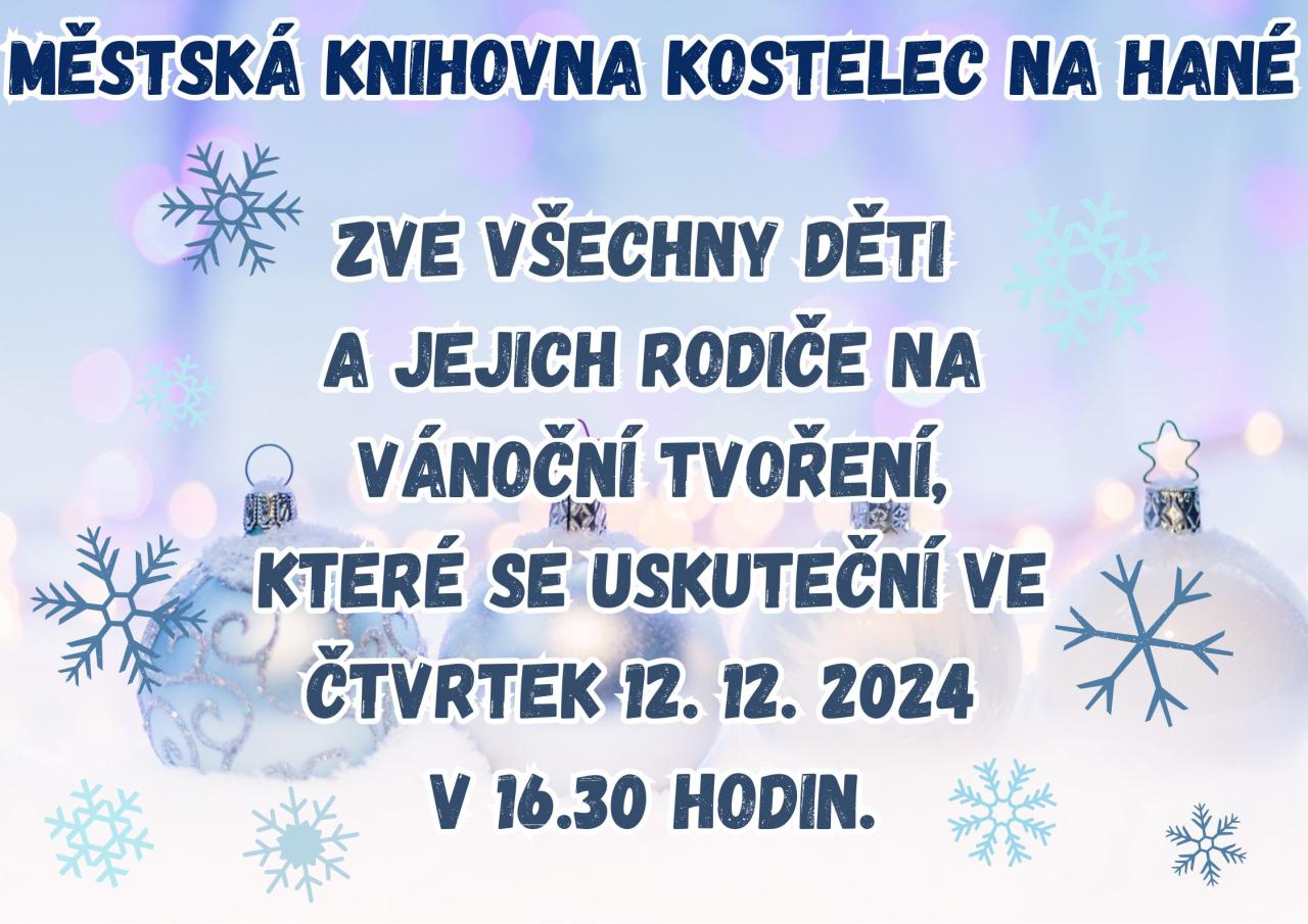 Městská knihovna Kostelec na Hané zve všechny děti a jejich rodiče na vánoční tvoření, které se uskuteční ve čtvrtek 12.12.2024 v 16.30 hodin.