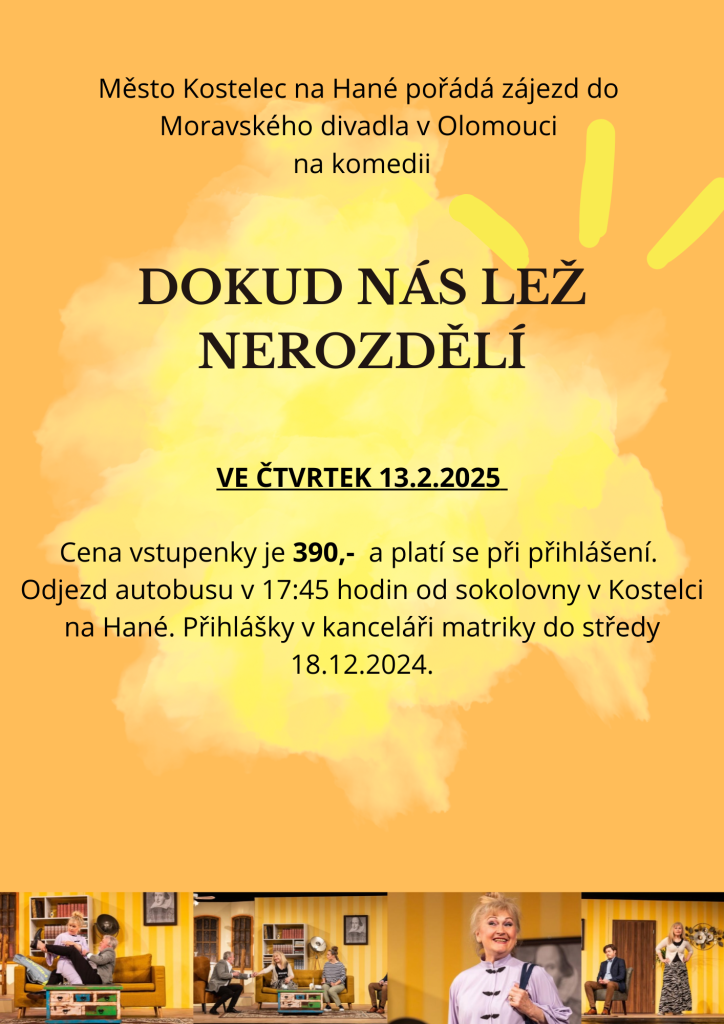 Město Kostelec na Hané pořádá zájezd do Moravského divadla v Olomouci, který se uskuteční ve čtvrtek 13.2.2025. Přihlásit se je možné do středy 18.12.2024. Cena vstupenky je 390 kč.